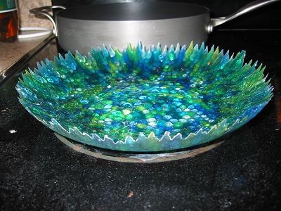 Melting beads, it couldn’t be easier and the only downside I’ve experienced is the smell as the beads are melting. The kitchen gets a little stinky, but the final product is worth it. I experimented at first with melting beads in non-stick baking pans. A 10-inch tart pan, because it had a nice scalloped edge, worked the best. We’ve hung them up in the kitchen windows and they look pretty when the sun shines through them.