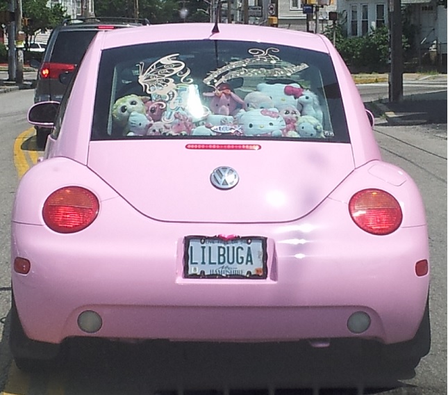 I was SO hoping to be able to use this picture for something when I took it.  I was coming off I-95 in Providence and this little pink bug was in front of me.  As I got closer I could see better what was in the window.  Clearly, she is a Hello Kitty fan…a BIG one!  You’d have to be to use your car as a container for carting your collection around town.