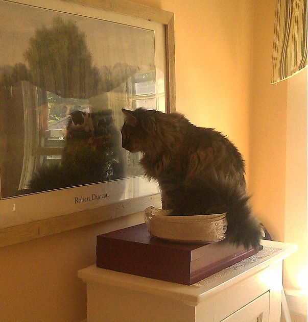 The Weekly Photo Challenge, Dialogue, prompted me to find pictures I’ve taken of our cats. I often see Bubba, sitting on top of the jelly cupboard staring into this framed print. He does it for several minutes at a time and occasionally will make a few small meows into the reflection. I’m not sure if its the dog, the cow, or the blonde haired girl in the picture or “the other cat” he sees, that’s most interesting to him. Nothing, not even treats in the window, will tear him away from his friend in the picture!